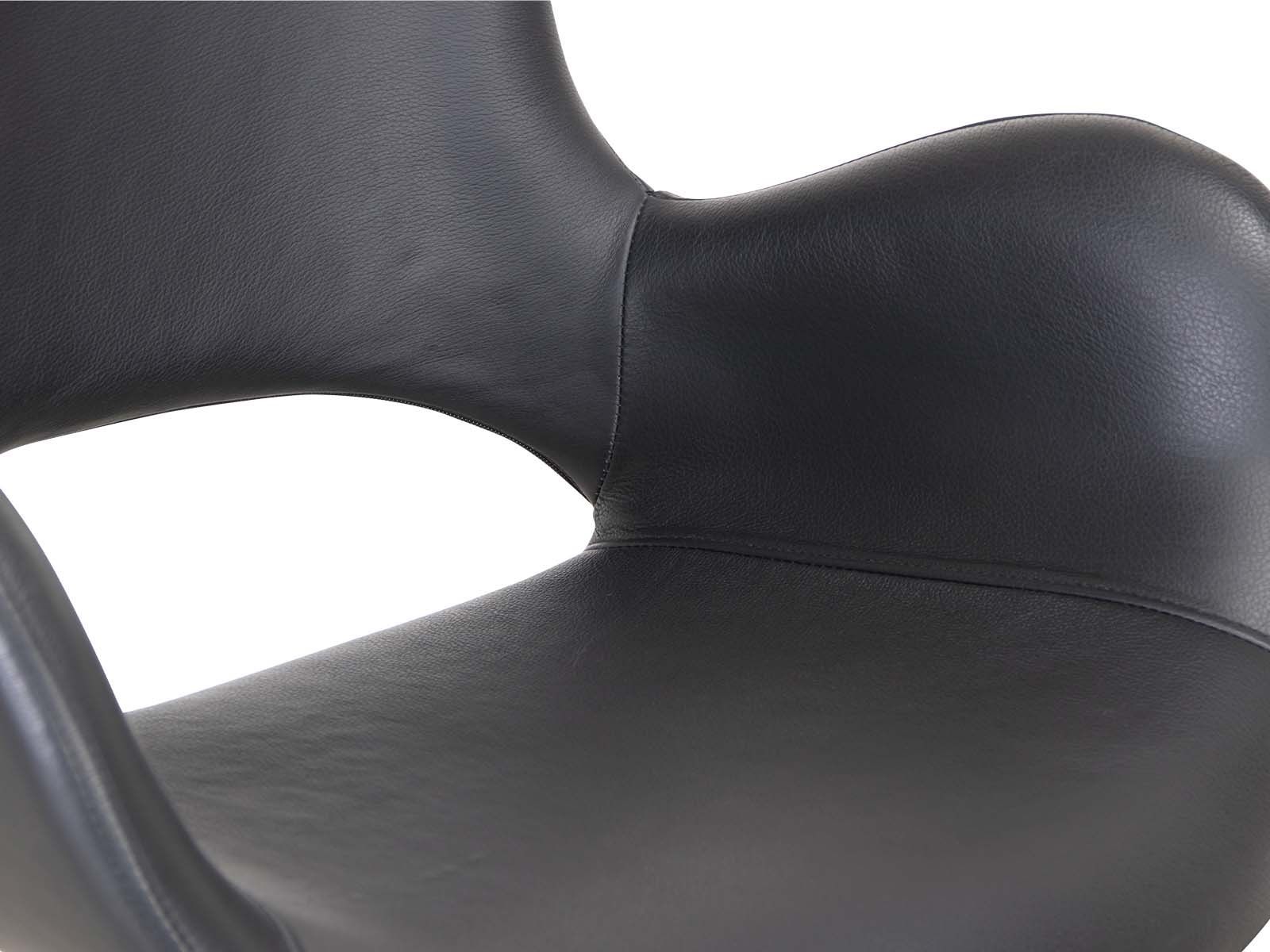 Den runde ryg og det ergonomiske design sikrer en komfortabel siddeoplevelse, selv ved længerevarende brug. Det sorte stel tilføjer en moderne kontrast til læderets naturlige varme og gør stolen let at integrere i enhver indretningsstil – fra minimalistisk og moderne til klassisk og tidløs.