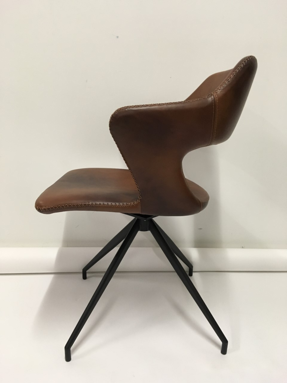 Swing-stolen er polstret med slidstærkt læder, som sikrer lang holdbarhed og en behagelig siddekomfort. De sorte metalben, der er udstyret med drejefunktionen, giver stolen et moderne og strømlinet look, mens materialernes kvalitet gør den robust og velegnet til daglig brug. Med en sædehøjde på 45 cm og armhøjde på 69 cm er stolen ergonomisk designet for at give optimal støtte og komfort, uanset om den bruges i spisestuen eller i mødelokalet.